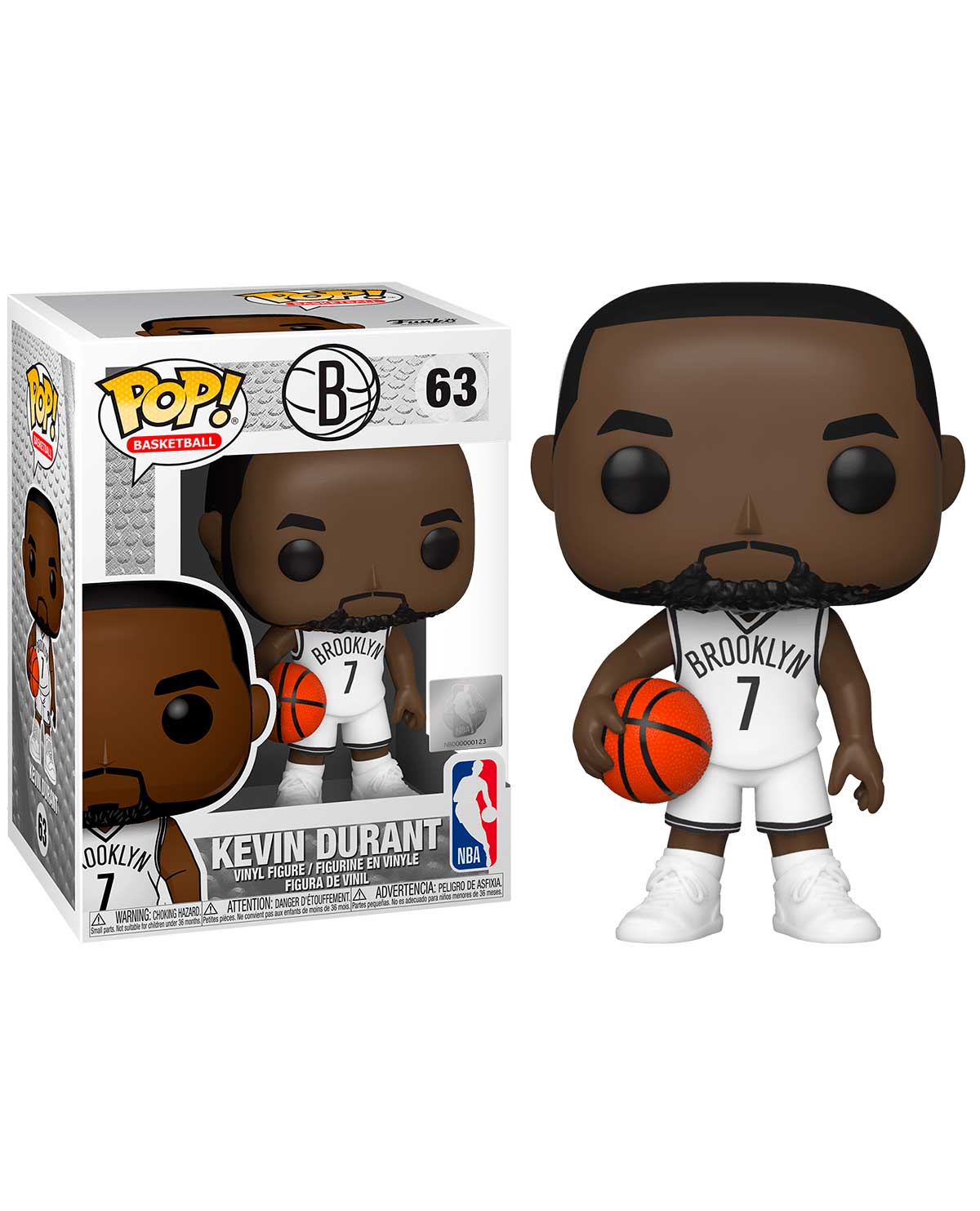 Este Pop presenta a Kevin Durant de los Nets de Brooklyn. Él porta el uniforme del equipo mientras sostiene un balón de baloncesto.