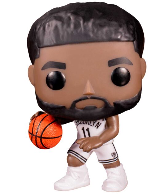Este Pop presenta a Kyrie Irving de los Nets de Brooklyn. Él porta el uniforme del equipo mientras sostiene un balón de baloncesto.