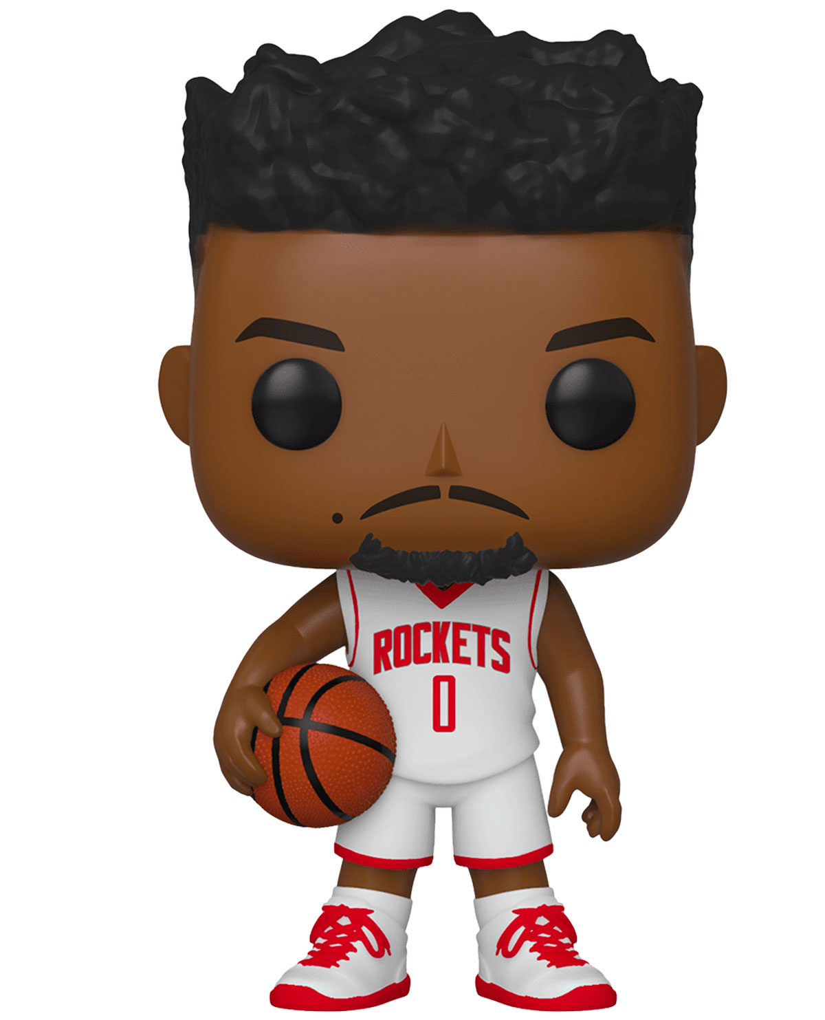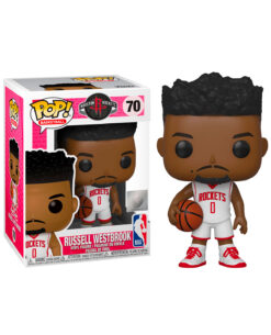 Este Pop presenta a Russell Westbrook de los Rockets de Houston. Él porta el uniforme del equipo mientras sostiene un balón de baloncesto.