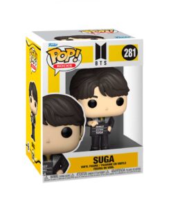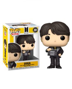 ¡Tu colección de música puede derretirse al ver estos Pop! de BTS! Suga adopta una pose criminalmente impresionante mientras sostiene un cartel con una foto policial.