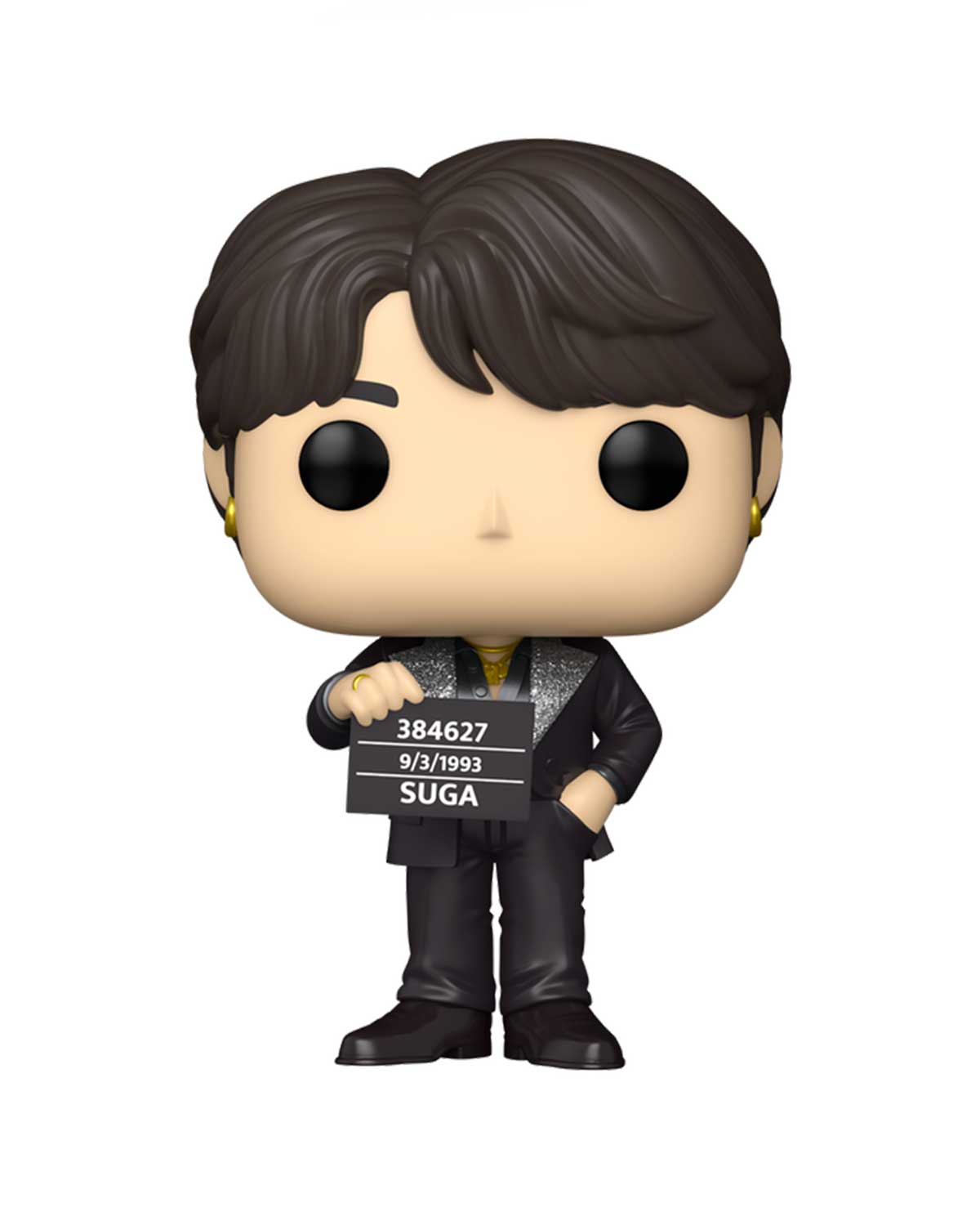 ¡Tu colección de música puede derretirse al ver estos Pop! de BTS! Suga adopta una pose criminalmente impresionante mientras sostiene un cartel con una foto policial.
