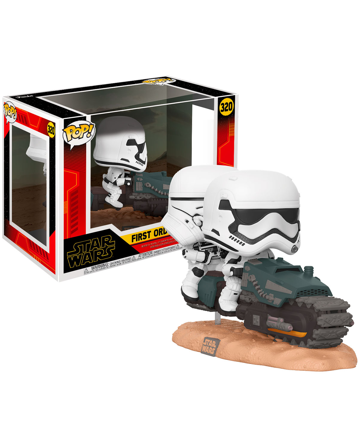 Este Pop presenta a dos Stormtroopers de la Primera Orden montando su nuevo vehículo, el Tread Speeder, ¡el cual hará su debut en la película!