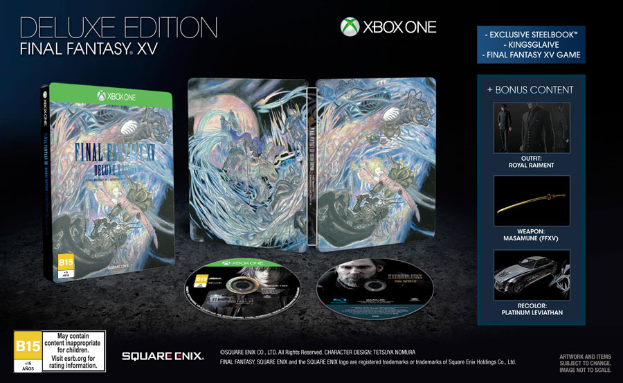 La Deluxe Edition contiene todo el contenido de la Edición Day one, más dos Steelbook exclusivos que contienen el juego de FINAL FANTASY XV y el Blue-ray KINGSGLAIVE. También inlcuye el DLC del automóvil y la vestimenta de KINGSGLAIVE.