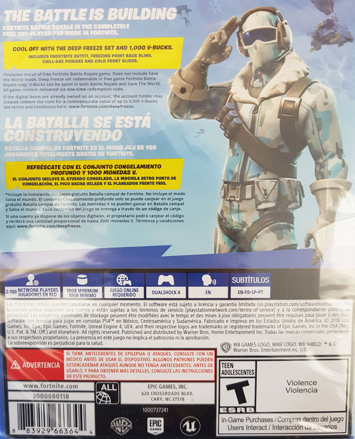Fortnite: Deep Freeze Bundle incluirá el juego de Fortnite Battle Royale y contenido premium, incluyendo el Traje Congelado, el Deslizador de Frente Frío, el Pico Frío, la Back Bling de Punto Congelado y 1,000 monedas-V, que pueden usarse para comprar artículos dentro del juego, como trajes y el Pase de Batalla Premium. En Fortnite Battle Royale, los jugadores podrán unirse y competir para ser el último de pie en un modo PvP para 100 jugadores, en donde construirán su cubierta, combatirán oponentes y sobrevivirán por el mayor tiempo posible para ganar su victoria.
