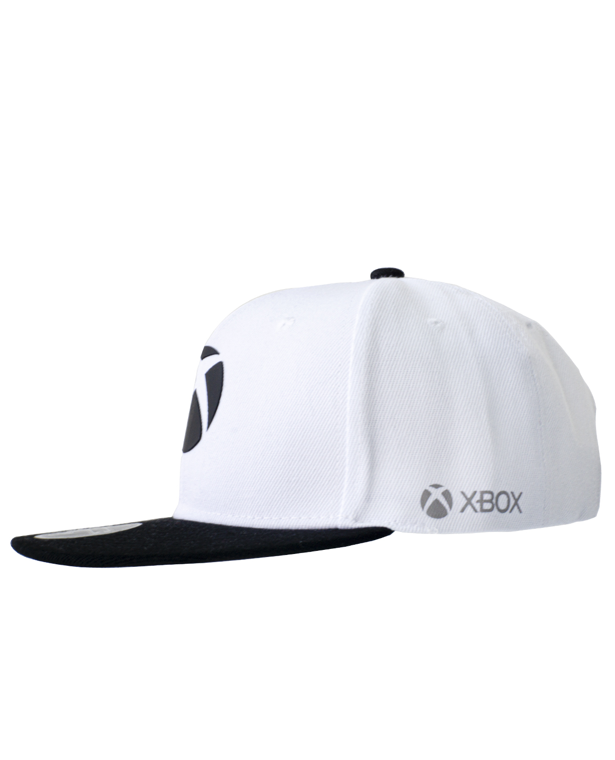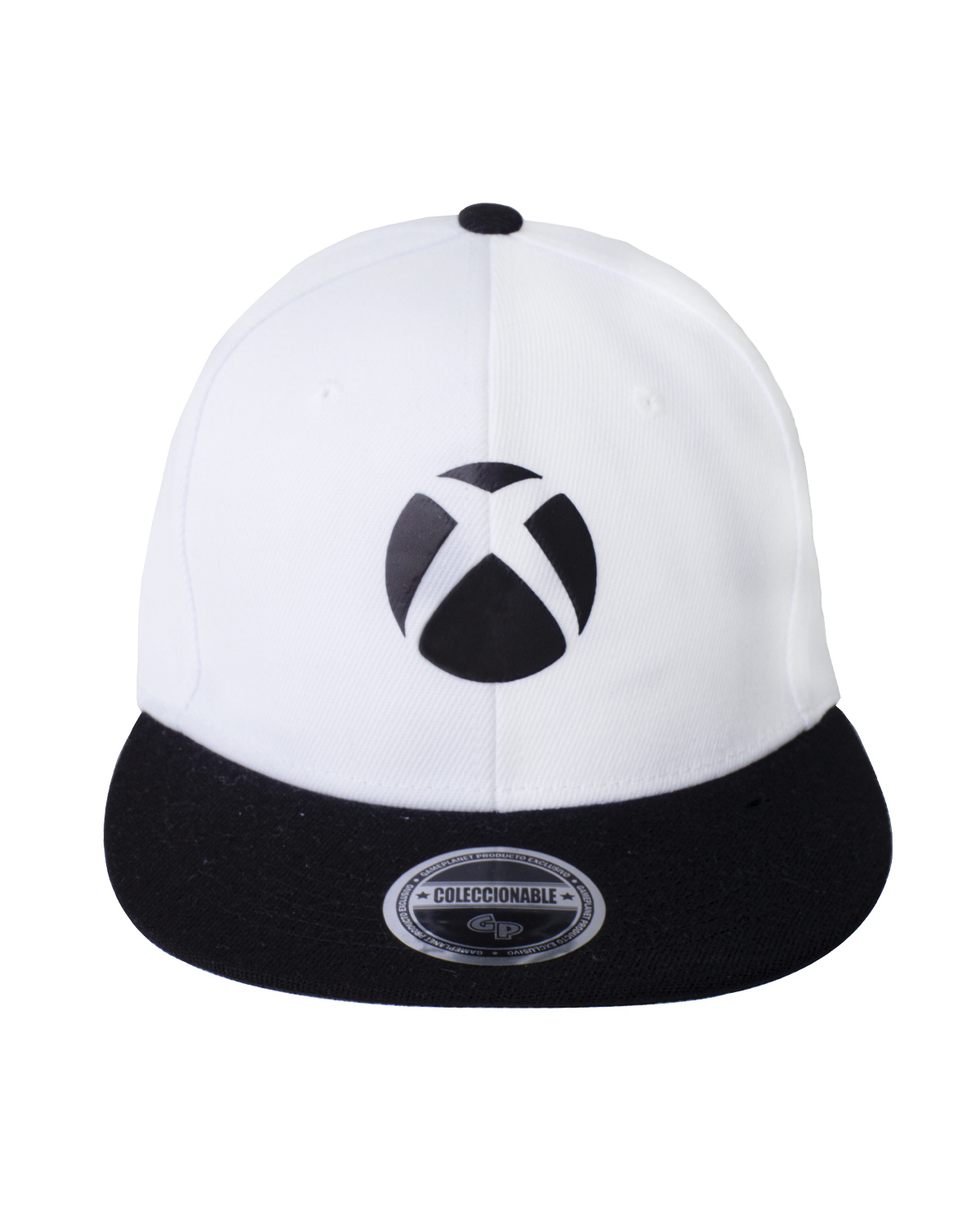 Gorra estilo snapback, blanca con visera negra. Logotipo de Xbox al centro y al costado izquierdo.