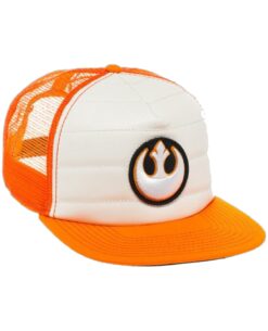 ¡Muestra tu estilo rebelde cuando uses este colorido y genial gorra de Star Wars! El Star Wars Rebel Pilot Trucker Hat es blanco en la parte delantera con una visera naranja y lados y parte posterior de malla naranja, con un cierre de presión en la parte posterior. ¡La gorra presenta un frente de piel sintética bordado con el símbolo de la Alianza Rebelde de la saga Star Wars!