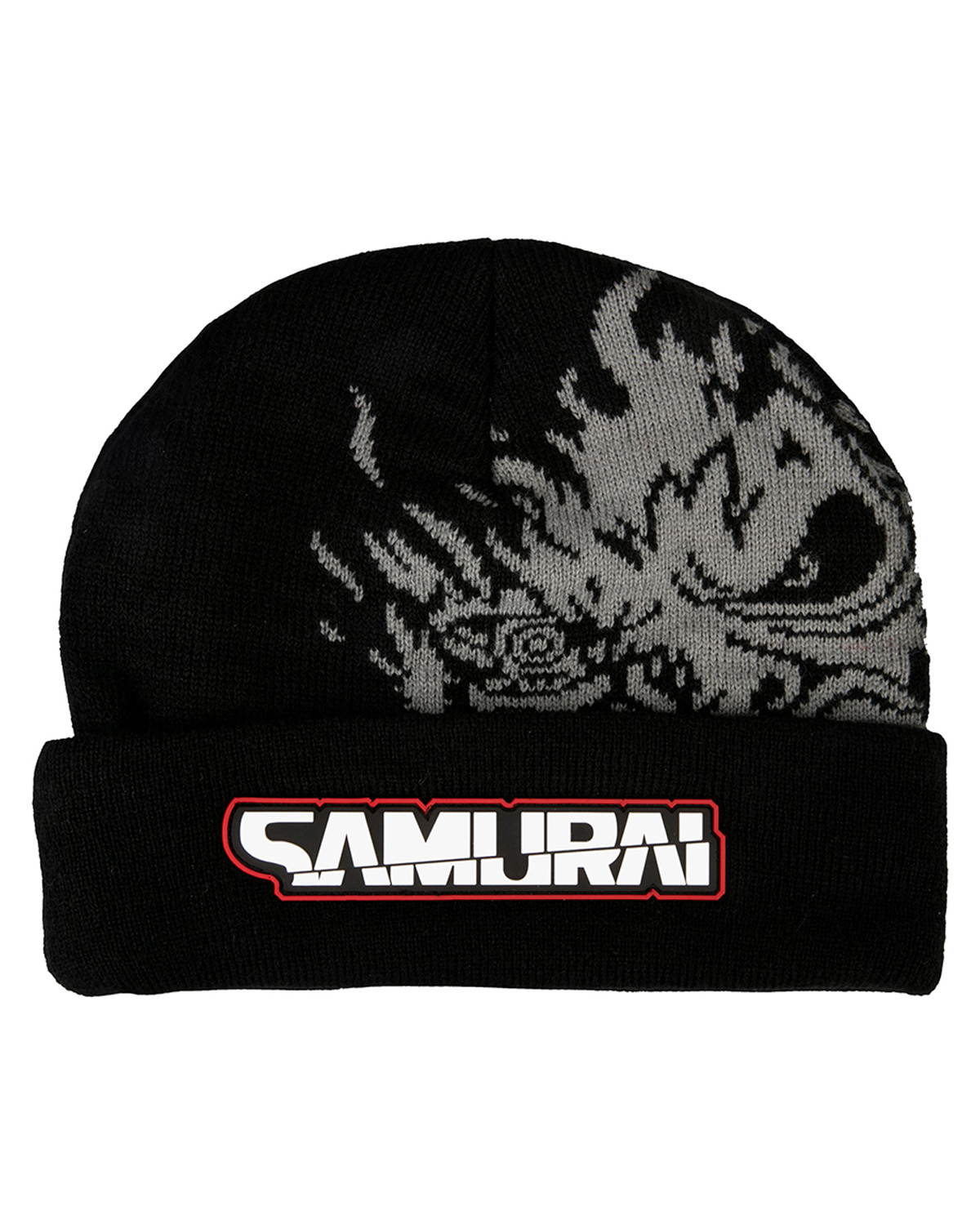 PARA LOS FANS DE LOS VIDEOJUEGOS CYBERPUNK 2077: Gorro de punto negro con diseño de máscara Samurai tejido en la parte superior de la gorra y puño plegable frontal con parche de goma Samurai.