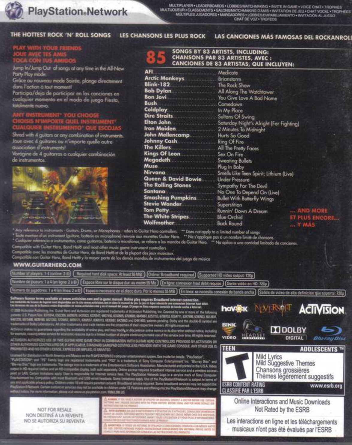 La multimillonaria y aclamadísima franquicia de Activision, Guitar Hero, viene con una nueva entrega llena de canciones y sorpresas que te harán rockear como nunca con rolas de grupos como: A Perfect Circle, AFI, Beastie Boys, Blink-182, Bon Jovi, Children of Bodom, Coldplay, David Bowie, Deep Purple, Elton John, Iggy Pop, Iron Maiden, Kiss, Megadeth, Mötley Crüe, Muse, Nirvana, No Doubt, Queens of The Stone Age, Rammstein, Rush, Santana, Smashing Pumpkins, The Rolling Stones y muchos otros más.