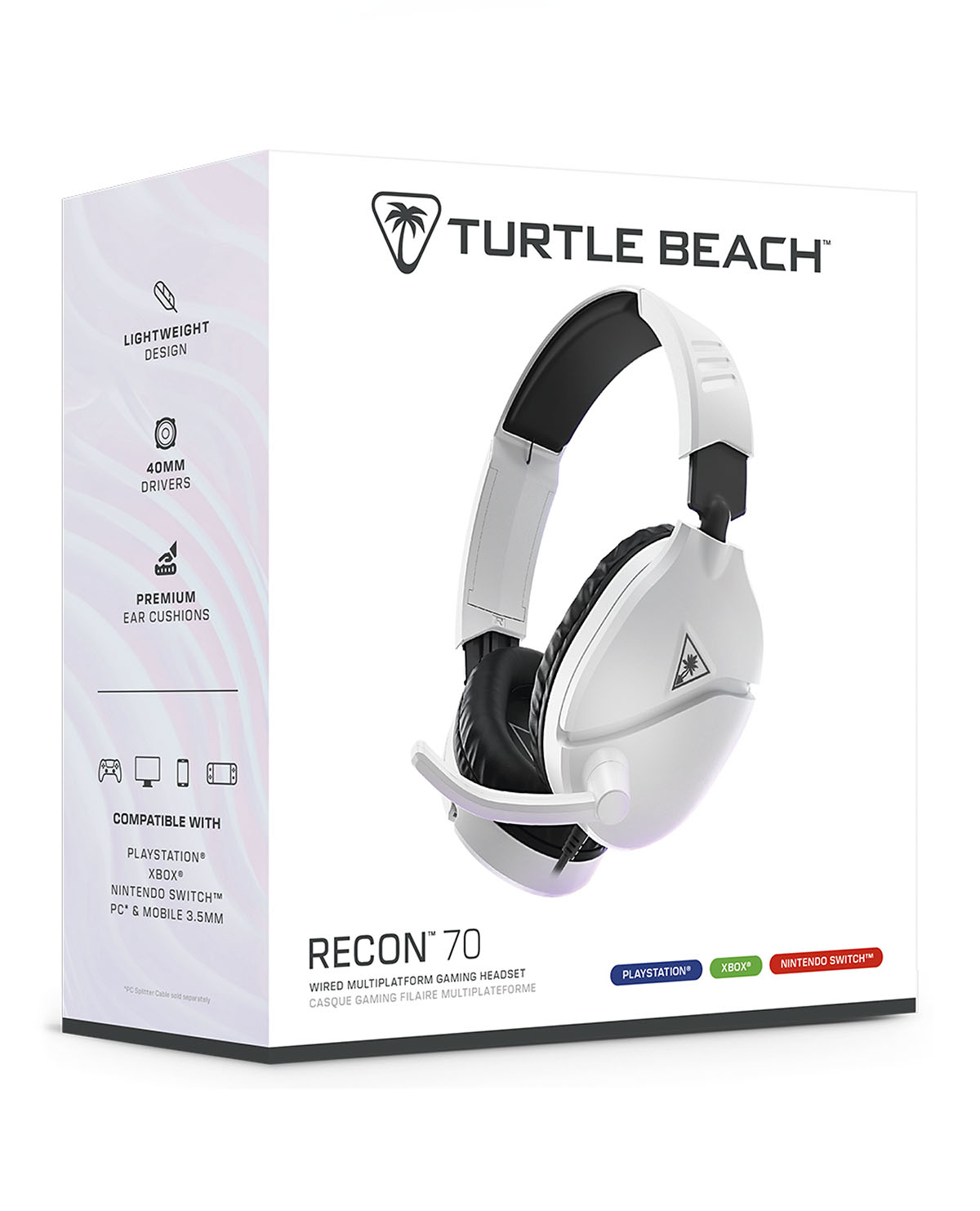Diseñados para tu próxima victoria, tu último logro y mucho más, los auriculares para juegos multiplataforma Turtle Beach® Recon 70 cuentan con el último diseño de auriculares livianos y cómodos de Turtle Beach para horas de juego, con parlantes de 40 mm de alta calidad y almohadillas de cuero sintético premium que te permiten escuchar cada agudo nítido y cada grave atronador mientras bloquean el ruido.