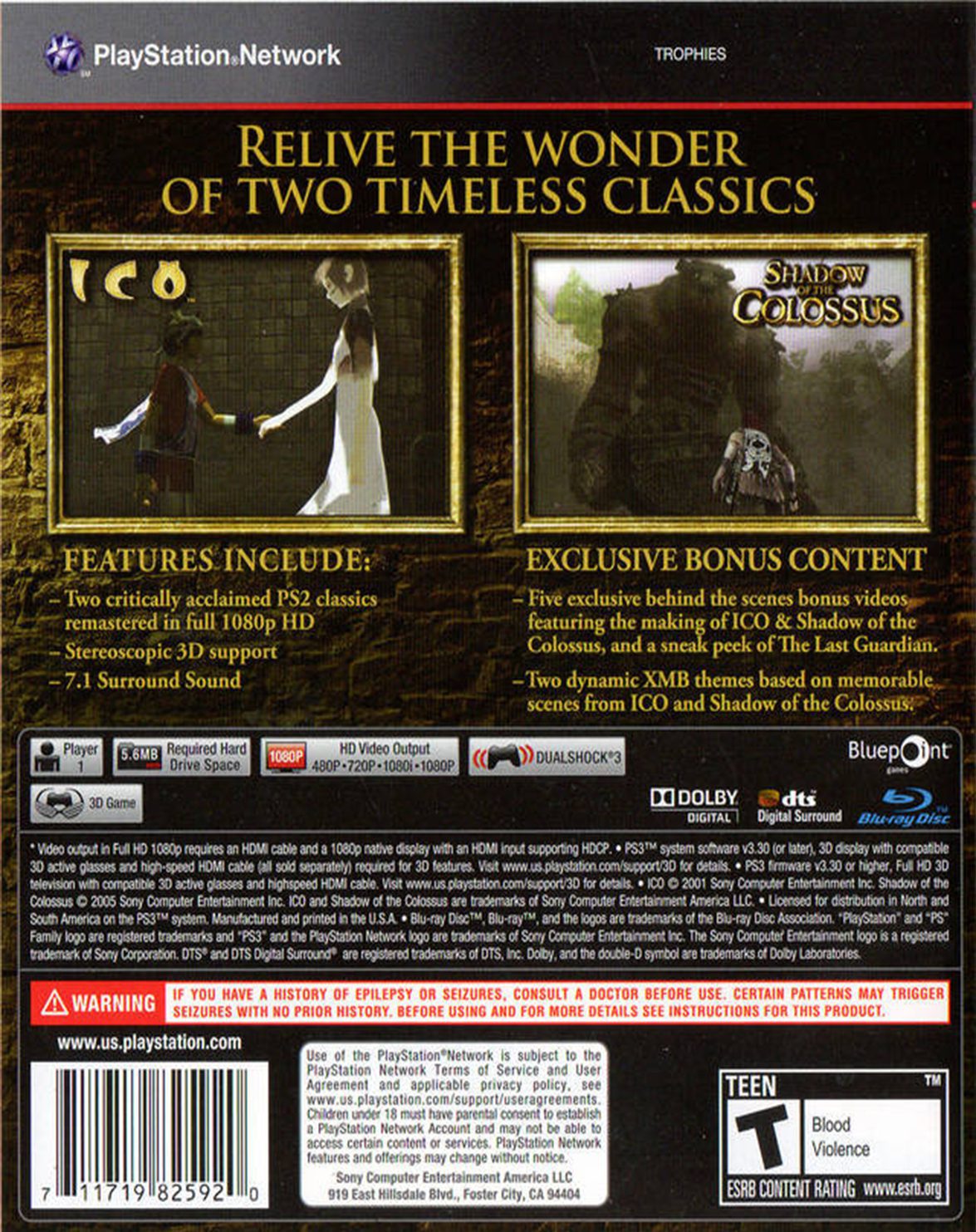 Compilación y remasterización de dos grandes juegos lanzados originalmente para la consola PlayStation 2. ICO y Shadow of the Colossus, con trofeos y compatibilidad 3D.