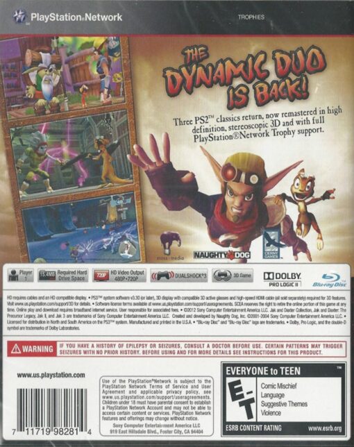 Pack recopilatorio con las tres primeras entregas de la serie Jak & Daxter completamente remasterizadas en alta definición. Los tres juegos muestran gráficos adaptados a la alta definición con imágenes más nítidas, unas animaciones más suaves, soporte para los trofeos y la posibilidad de disfrutar de la acción usando gafas 3D estereoscópicas.
