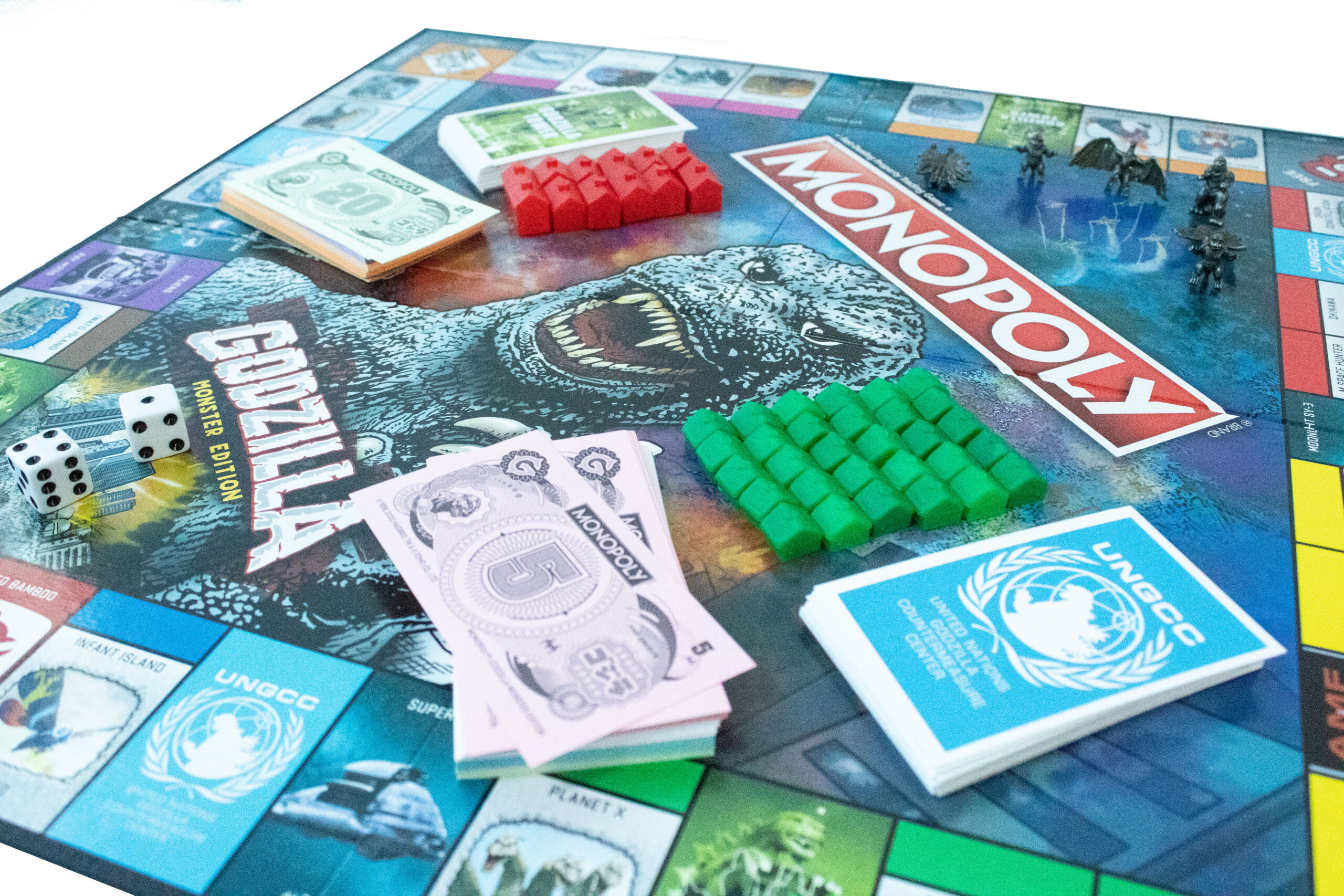 – Casas renombradas FACILITIES, Hoteles renombrados BASES, Tarjetas de Cofre de la Comunidad renombradas Tarjetas UNGCC y Tarjetas de Chance renombradas Tarjetas GODZILLA TOWER Cards
