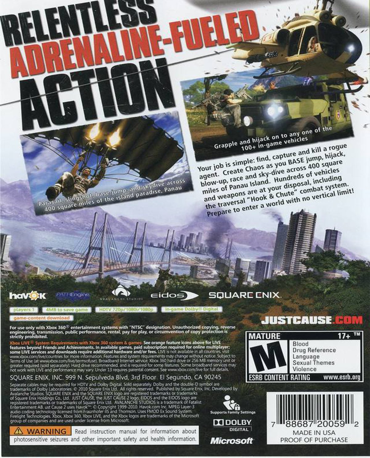 Después de una espera de 4 años, Eidos y Square-Enix nos traen la secuela de la serie Just Cause, que se desarrolla en la isla de Panau en Asia Central. En esta nueva entrega tenemos de regreso a Rico Rodriguez, agente encubierto de La Agencia cuyo objetivo es muy claro: Detener cualquier amenaza terrorista.