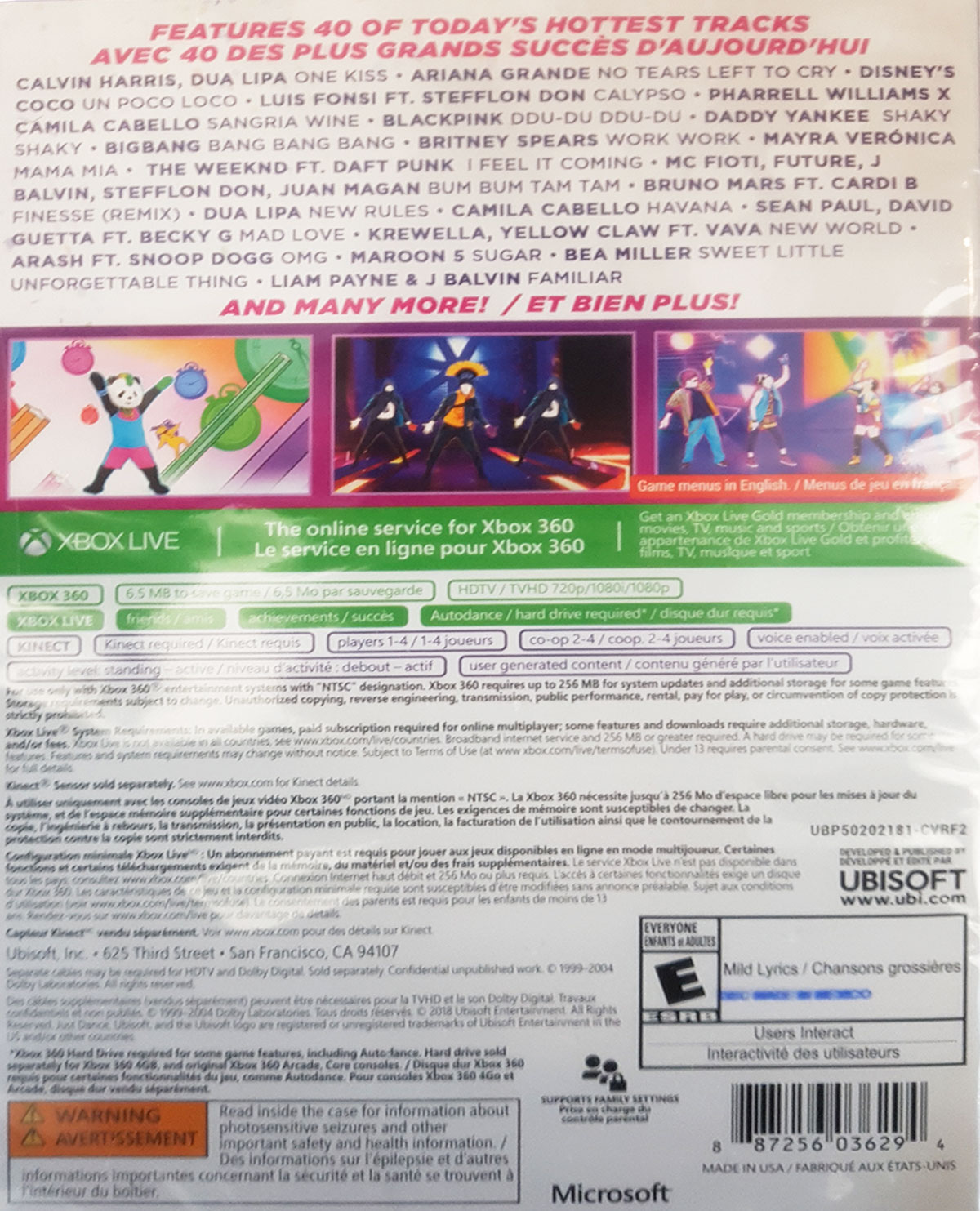 ¡Just Dance 2019 es el mayor juego de fiestas con 40 increíbles éxitos que van desde los éxitos del momento hasta los favoritos de toda la familia, entre los que están “Finesse (Remix)” de Bruno Mars Ft. Cardi B., “Havana” de Camila Cabello, “Bang Bang Bang” de BIGBANG, “Shaky Shaky” de Daddy Yankee y mucho más!
