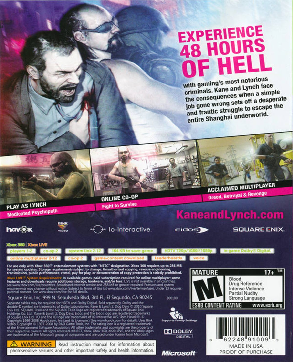 Kane y Lynch regresan a impartir caos y destrucción en la continuación de Dead Men. En Dog Days, tomarás control principal de Lynch (a diferencia de la entrega anterior donde controlabas a Kane), a través de cuyos ojos se desarrolla la historia. El sistema de juego en tercera persona regresa, con la diferencia de que el sistema de cobertura ya es por un botón y no automático, y sólo puedes cargar dos armas sin compartirlas entre aliados.