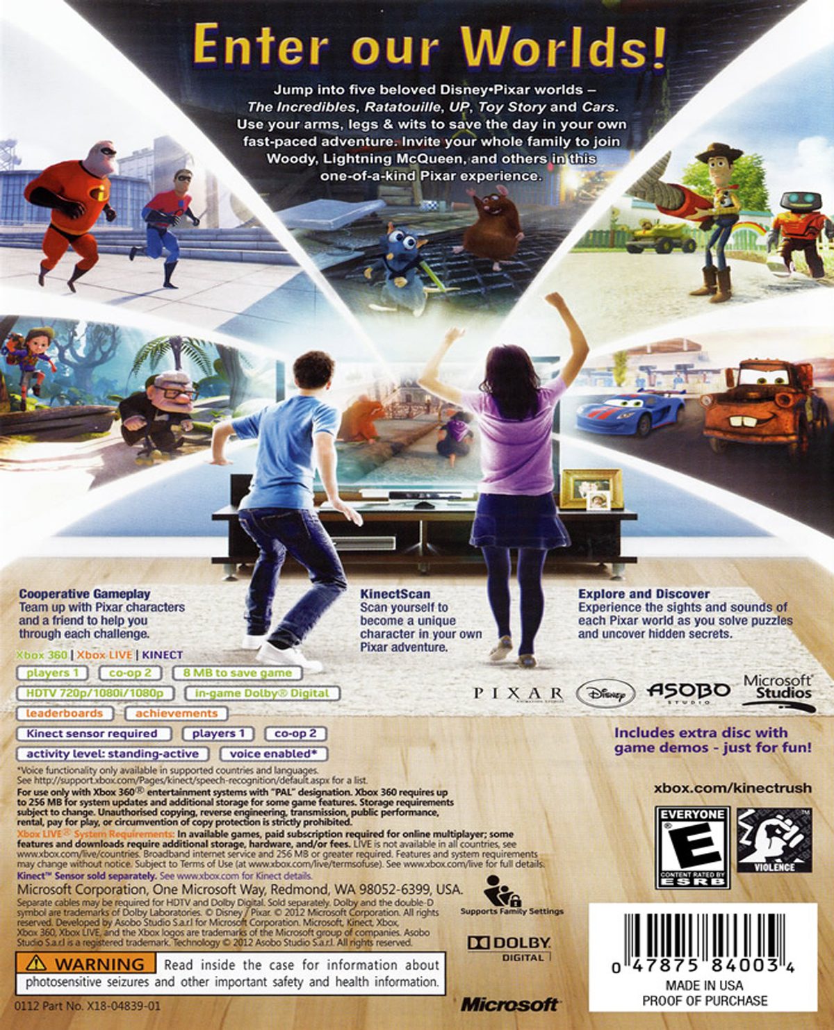 - Conviértete en el héroe: Escanea tu cuerpo gracias a la revolucionaria tecnología KinectScan para crear un Avatar personalizado con tus características únicas y conviértete en el héroe en cinco mundos Pixar diferentes.