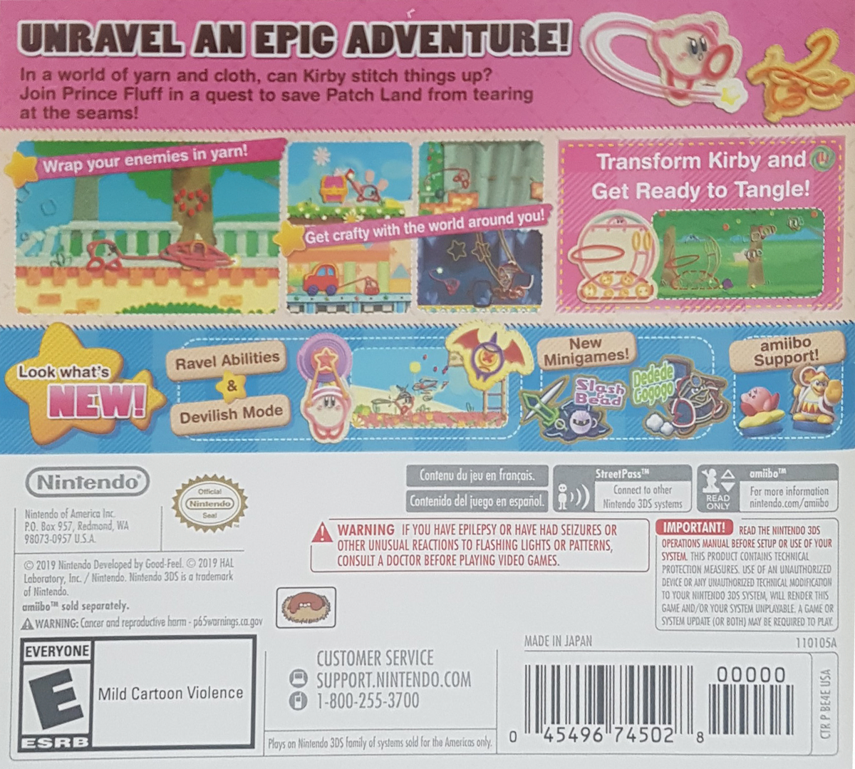Emprende la aventura y explora los distintos rincones del reino de los hilos. Deberás utilizar las habilidades de Kirby e hilar muy fino: usa el látigo de hilo para descubrir zonas ocultas y deshilar a los enemigos; transfórmate en objetos de hilo gigantes; y recoge cuentas brillantes mientras ayudas a Kirby a echarle un par de remiendos al reino.