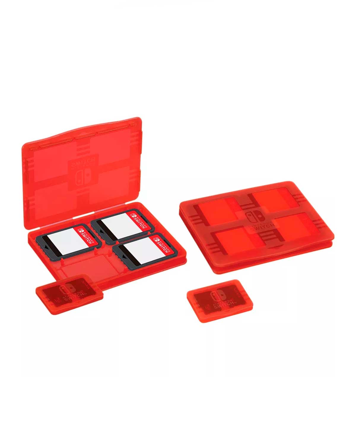 - El estuche rojo transparente para tarjetas de juego tiene capacidad para 4 tarjetas de juego de Nintendo Switch y se almacena debajo del sistema Nintendo Switch.