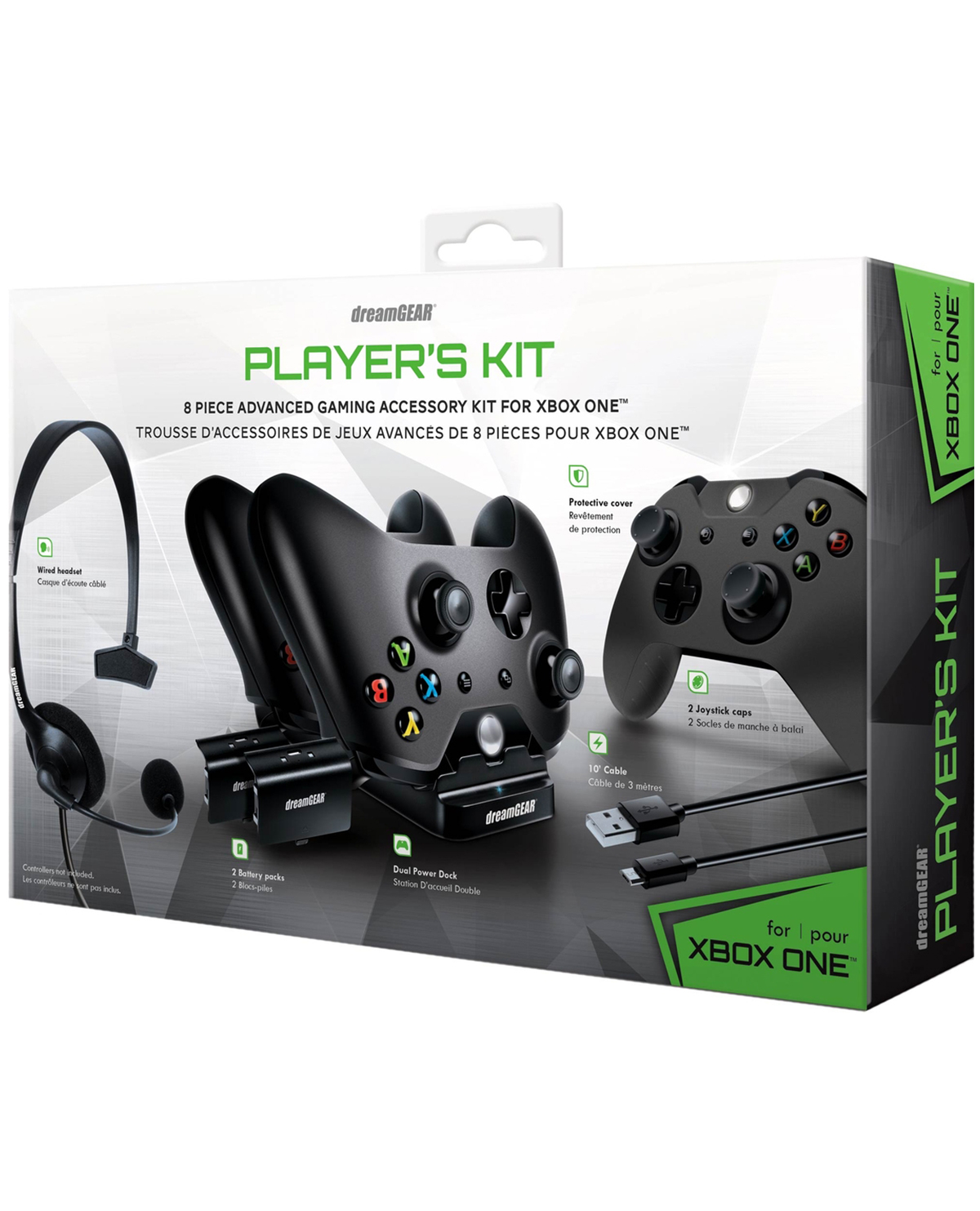 El Kit de jugador de Xbox One es el complemento perfecto. Una base de carga doble con dos baterías recargables para hasta 6 horas de reproducción continua, un cable de carga y sincronización de 3 metros, auriculares con micrófono de cristal claro y una cubierta protectora de silicona con tapas de joystick con textura hacen que este sea el kit imprescindible para cualquier jugador.