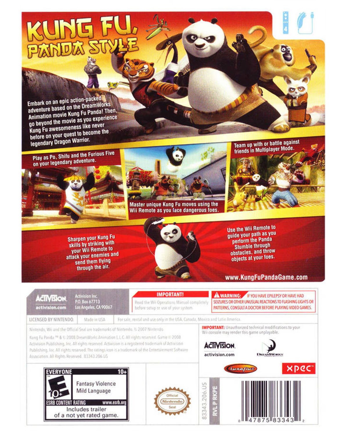El entrenamiento será arduo por varios niveles a través de todos los escenarios de la película, en el campo de batalla Po combate a la fuerzas del mal con gran ayuda de su enorme peso y muchos movimientos altamente estilizados, cuando su medidor de Chi llega al limite puede ejecutar un ataque devastador contra todos los enemigos cercanos, este puede ser una gran caída o convertirse en una bola gigante que rueda sobre todo a su paso; también existen divertidos minijuegos para entretener a toda la familia, como el combate rápido o una especie de Reversi chino, hasta 4 personas pueden participar en todas estas actividades.