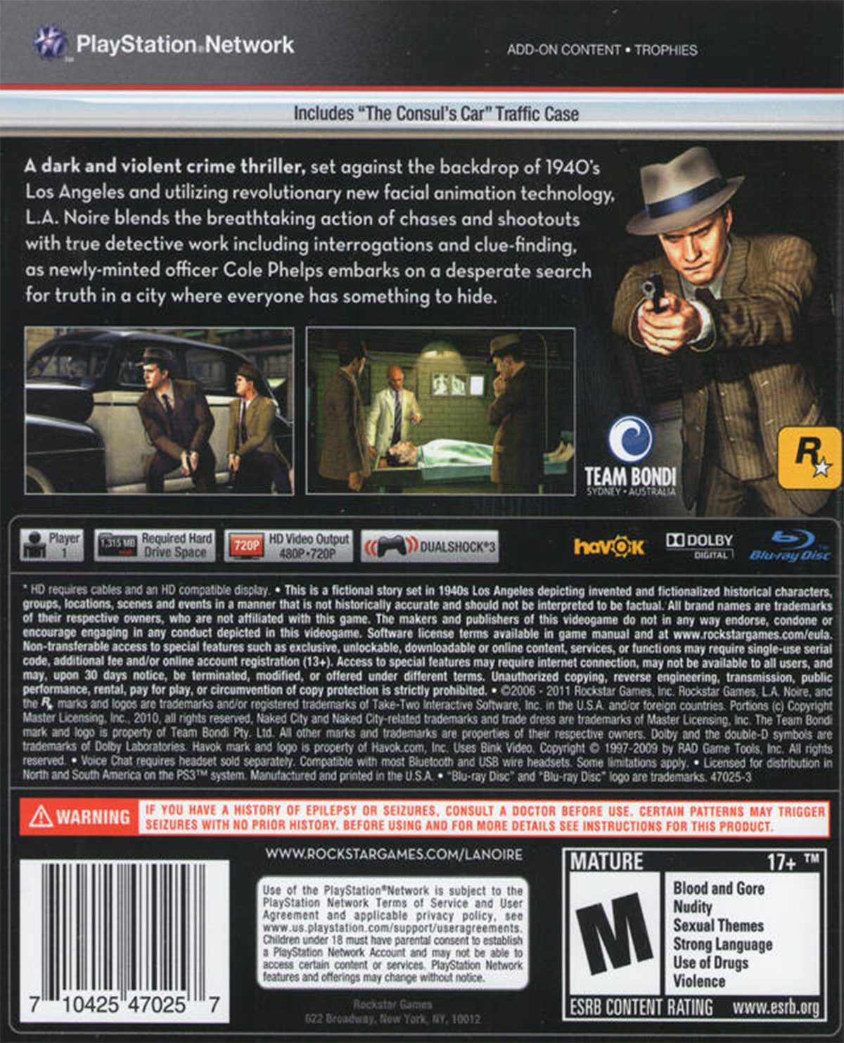 L.A. Noire hace referencia al cine negro (Film Noir), cine que se caracteriza por combinar de manera lúgubre y en tonos oscuros, géneros como el cine de mafiosos o el cine social. Mismos que habitualmente giran en torno a hechos delictivos con un fuerte contenido expresivo y una característica esterilización visual. El juego, al igual que el género cinematográfico, toma lugar en los 40; para ser precisos en 1947. Protagonizado por Aaron Staton (Mad Men, 2007) se inspira en la salvaje ola de asesinatos en serie asociados con la Dalia Negra. En aquella época, los psicópatas eran algo completamente inusitado y tal concepto como la policía forense no existía. Eso se tradujo en que, con frecuencia, los periodistas campaban a sus anchas en la escena del crimen al mismo tiempo que la policía. Es por eso que todos los casos más importantes de L.A. Noire se inspiran en sucesos reales ampliamente documentados en un ingente archivo fotográfico de aquellos asesinatos. Esto solo nos da una idea de la profundidad del trabajo de ambientación del que presume el título.