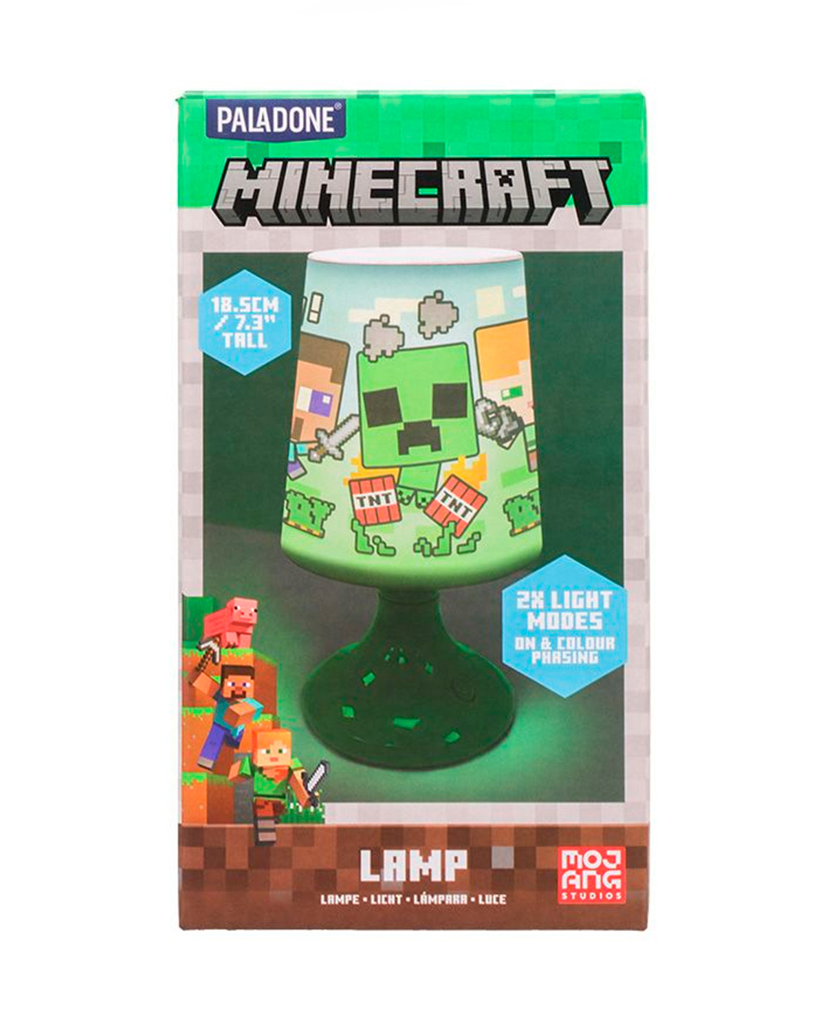La lámpara de mesa Minecraft mide 19 cm de alto. lo que la hace ideal para los fanáticos de este juego. La lámpara es compacta, lo que permite colocarla en un escritorio, mesita de noche o cualquier otra superficie donde quieras agregar un toque de ambiente Minecraft. Tiene dos modos de luz: luz normal y un modo donde los colores cambian gradualmente. Puede alimentarse con un cable USB o tres pilas AA (no incluidas).