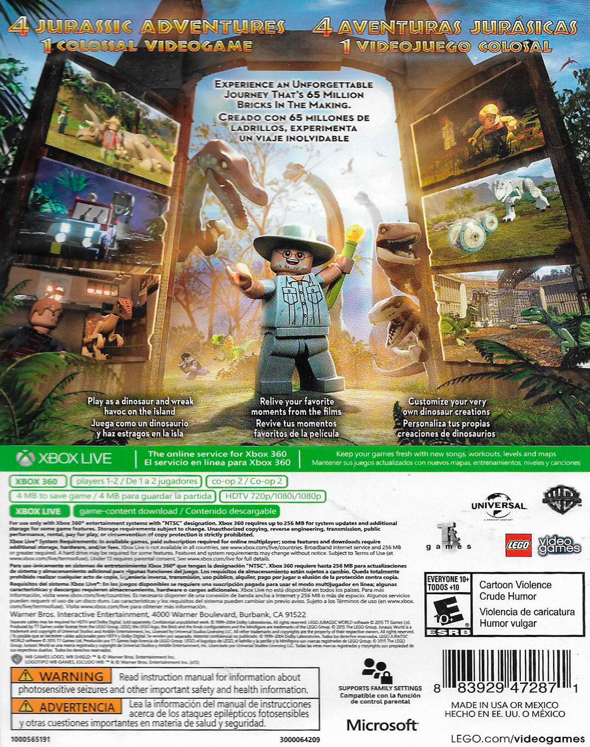 “Siguiendo de las historias épicas de Parque Jurásico, El Mundo Perdido: Parque Jurásico y Parque Jurásico III , así como la esperado Jurassic World, LEGO Jurassic World es el primer videojuego en el que los jugadores podrán revivir y experimentar las cuatro películas jurásicas. Reimaginado en forma de LEGO y contado con el sentido del humor característico de los juegos de TT Games, esta emocionante aventura recreará escenas inolvidables y secuencias de acción de las películas, permitiendo a los seguidores jugar a través de momentos clave y tener la oportunidad de explorar las tierras de Isla Nublar e Isla Sorna. Revive momentos clave de las cuatro películas de Jurassic: Una aventura de 65 millones años de trabajo -ahora en forma de LEGO.