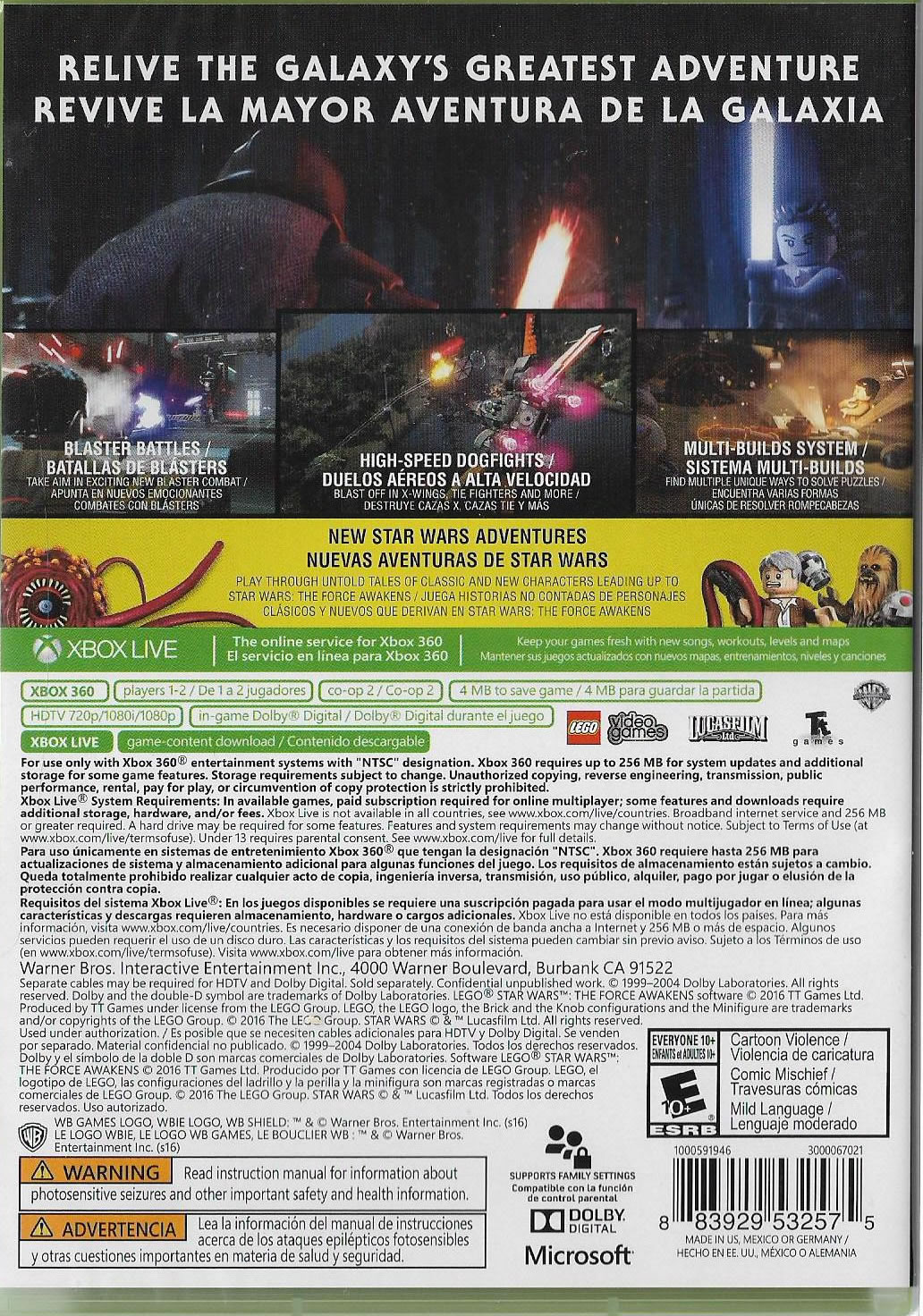 LEGO® Star Wars™: El Despertar de la Fuerza™ marca el regreso triunfante de la franquicia de videojuegos No. 1 de LEGO, sumergiendo a los fans en la nueva aventura de Star Wars como nunca antes. Los jugadores podrán revivir la épica acción de la taquillera película en una forma que sólo LEGO puede ofrecer, basada en Star Wars: El Despertar de la Fuerza e interpretada a través de la inteligente e ingeniosa visión de LEGO. El juego también presentará contenido exclusivo que llevará a los jugadores a las aventuras entre Star Wars: El Regreso del Jedi y Star Wars: El Despertar de la Fuerza, ofreciendo una mirada adicional de la película y sus personajes.