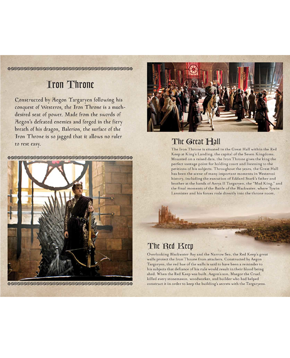 Hecho de las espadas de los enemigos derrotados de Aegon y forjado en el hálito ardiente de su dragón, Balerion, las superficies del trono de hierro son tan dentadas y peligrosas que no permite a ningún gobernante descansar fácilmente.