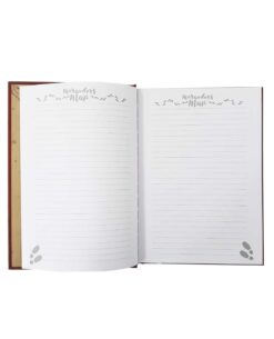 Esta libnreta cuenta con un cuidado diseño de portada, en un elegante color granate y con el conocido Mapa del Merodeador, sin duda uno de los objetos más fascinantes de la saga. En el interior tiene los iconos de las huellas del mapa en la esquina de cada página.