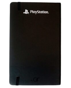 Libreta Playstation negra matte con símbolos en relieve brillante y logo en portada.