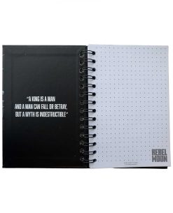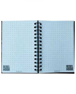 Con una portada impactante que refleja la atmósfera futurista y rebelde de Rebel Moon, esta libreta destaca por su diseño atractivo y detalles cuidadosamente elaborados. Los gráficos inspirados en la saga adornan la portada, haciéndola un verdadero objeto de colección.