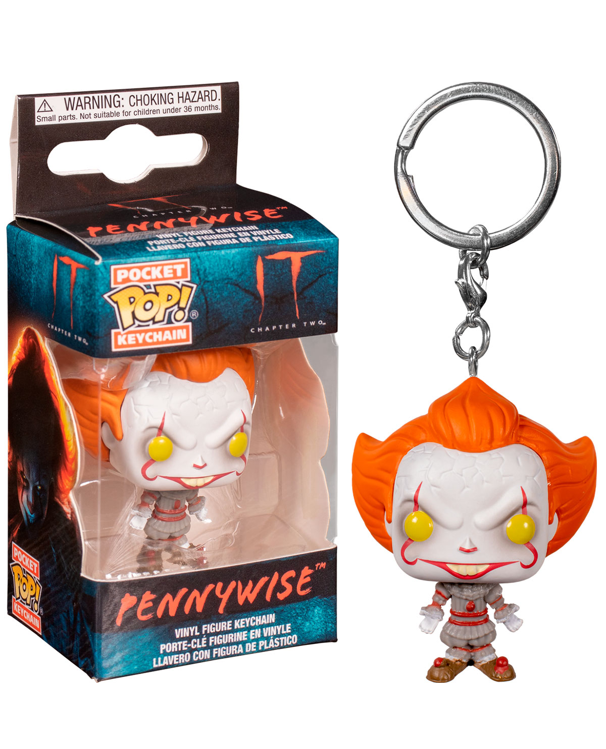 Este llavero Pop presenta a Pennywise con una sonrisa malévola y los brazos abiertos.
