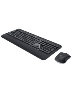 El mouse inalámbrico de forma contorneada para uso ambidiestro y el recubrimiento de goma suave ofrecen excelente soporte para la mano, y el seguimiento mejorado y el preciso control del cursor facilitan el uso., Los prácticos botones de acceso rápido más esenciales agilizan el uso del material multimedia, la calculadora y las funciones de comprobación de pilas., Empieza a utilizar el teclado y el mouse con solo conectarlos, mediante un diminuto receptor USB con tecnología Logitech Unifying; obtendrás una conexión inalámbrica fiable y cifrada a una distancia de hasta 10 metros., Las teclas se optimizaron para mejorar la precisión y reducir el ruido. Tus dedos encontrarán fácilmente su sitio gracias a la distribución y superficie de teclas habituales., El reposamanos y las patas extensibles con inclinación ajustable contribuyen al confort durante periodos de uso prolongado.