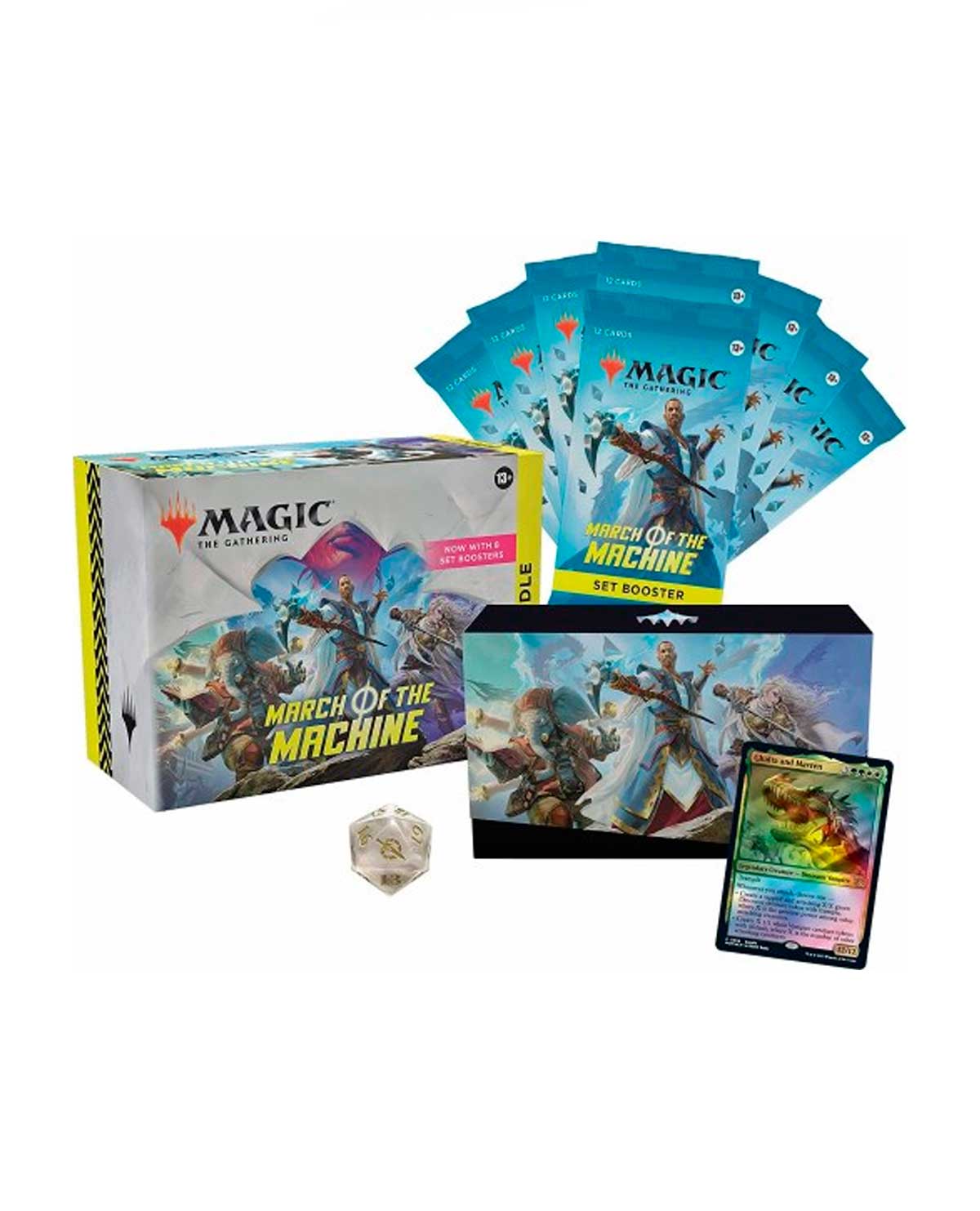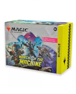 Contiene 8 sobres del conjunto March of the Machine, los mejores sobres para abrir solo por diversión, además de accesorios, con 1 carta promocional tradicional foil con arte alternativo, 40 tierras básicas (20 tradicionales foil y 20 no foil), 1 Contador de vida Spindown de gran tamaño, 1 caja de almacenamiento de tarjetas y 2 tarjetas de referencia.