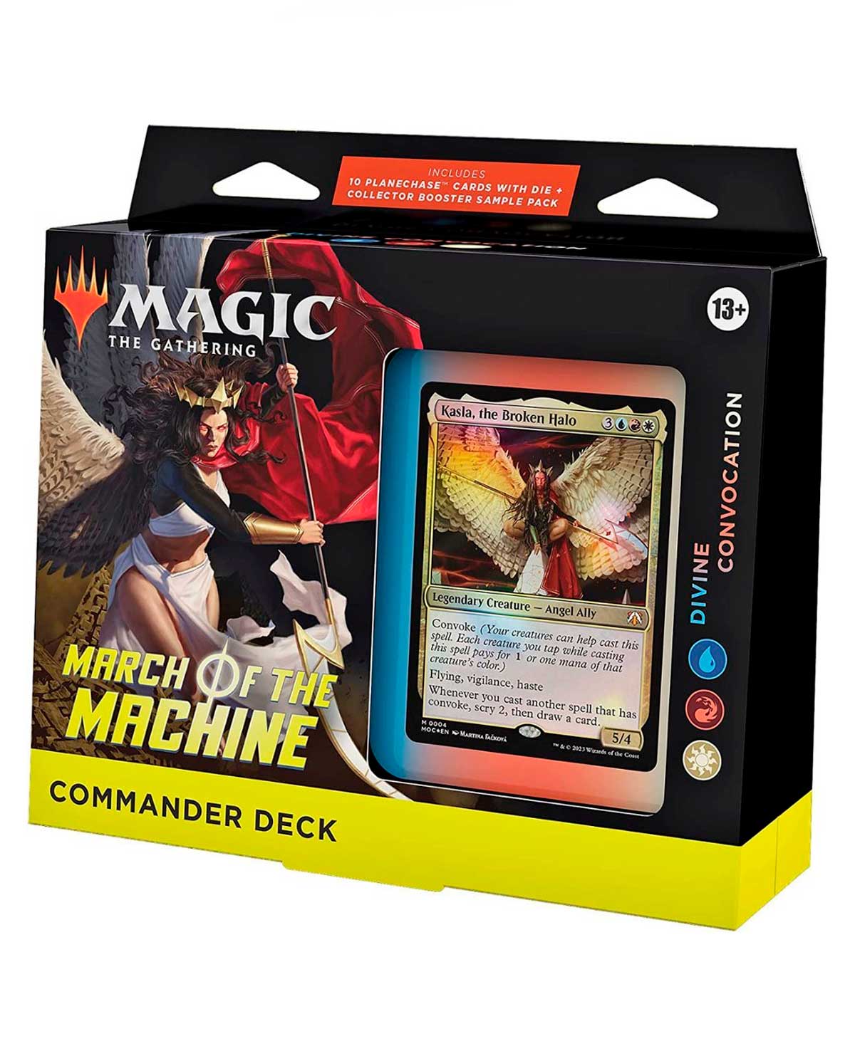 - Convocatoria Divina: Mazo March of the Machine Commander de 100 cartas listas para jugar con 2 cartas legendarias de papel tradicional y 98 cartas sin papel de aluminio.