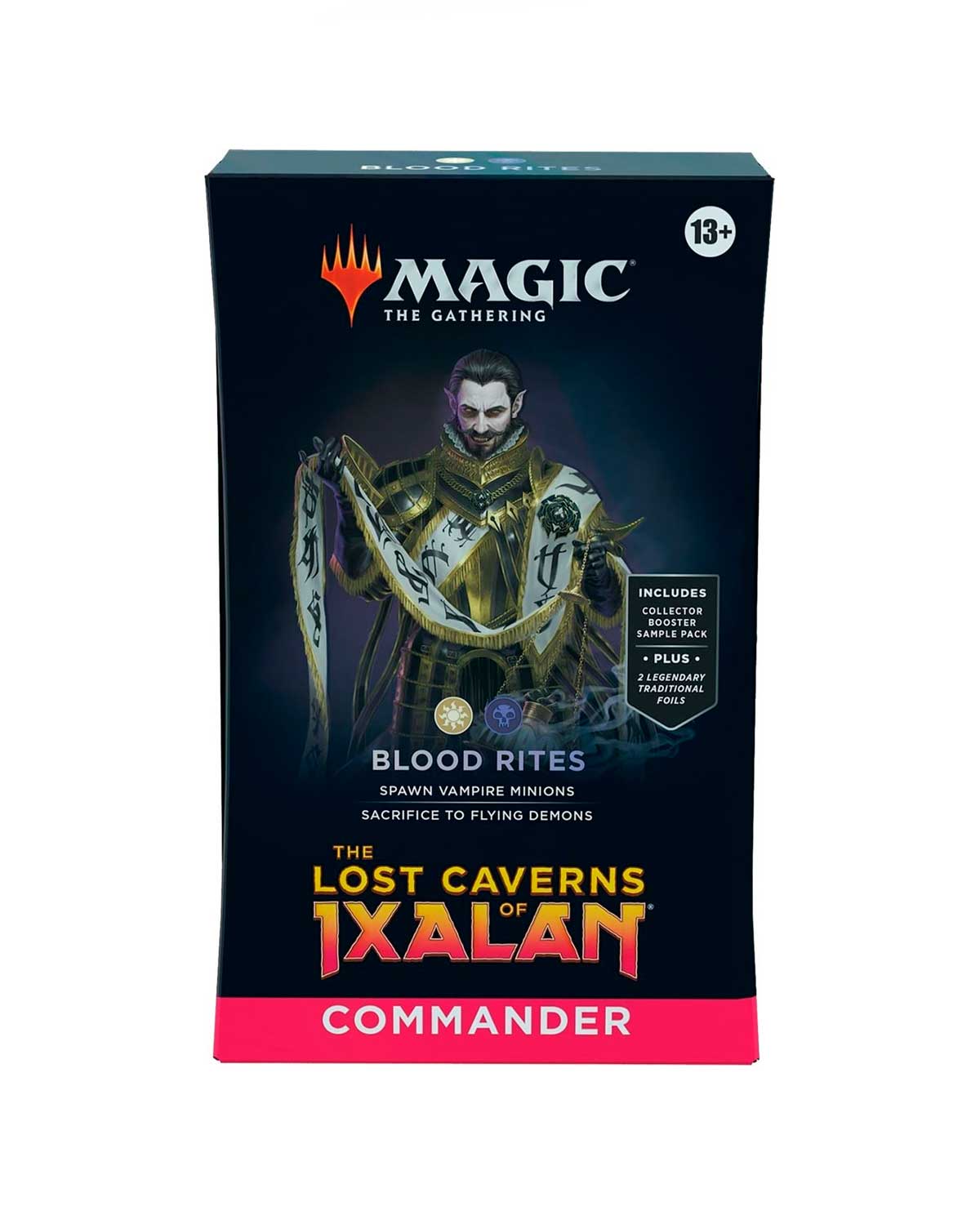 Consigue un mazo listo para jugar nada más sacarlo de la caja y experimenta el formato multijugador más popular de Magic: The Gathering. La baraja Commander Lost Caverns of Ixalan Blood Rites incluye 1 mazo blanco y negro de 100 cartas Magic (2 cartas legendarias tradicionales foil, 98 cartas no foil), un paquete de muestra de refuerzo de coleccionista de 2 cartas (contiene 2 cartas de borde alternativo, con 1 carta tradicional foil o no foil de rareza Rara o superior y 1 carta tradicional foil poco común), 1 Display Commander grabado en foil (una copia en cartulina gruesa de la carta de comandante con foil grabado en el borde y el arte de la carta), 10 fichas de doble cara, 1 caja de mazo (puede contener 100 cartas con fundas), 1 Life Wheel, 1 inserto de estrategia y 1 carta de referencia.