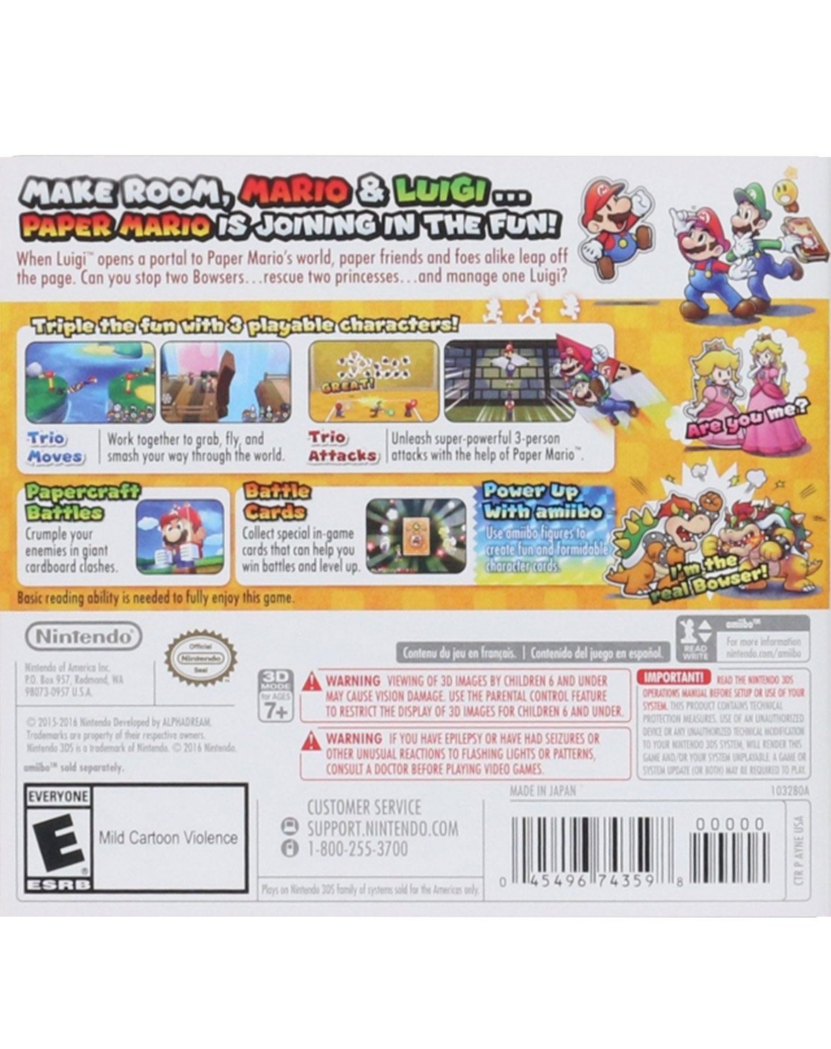 Mario y Luigi: Paper Jam es la entrada más reciente de la serie de Mario y Luigi RPG. Los habitantes de Paper Mario salen de las páginas de un libro misterioso y haciendo de las suyas en el Reino Champiñón. Mario, Luigi y Paper Mario deben unir fuerzas para salvar el día de los jefes gigantes utilizando un combo de micro-juegos basados en el ritmo y un robot papercraft gigante.