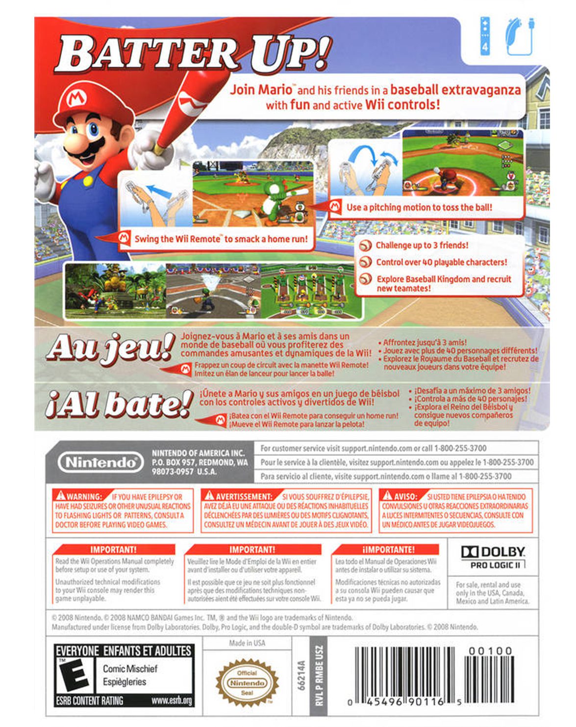Mario y su pandilla están de vuelta en esta entrega de la popular serie de Mario Sports. En esta iteración, el fontanero italiano invade el diamante del rey de los deportes. Sluggers ofrece un gameplay sumamente accesible, constuiro para aprovechar las capacidades del Wii. Con cinco modos de juego diferentes, tanto para uno como varios jugadores, y 14 personajes diferentes a escoger, todos del universo de Mario, Sluggers es una experiencia como ninguna otra. ¡Anota un Homerun en el Reino Hongo!