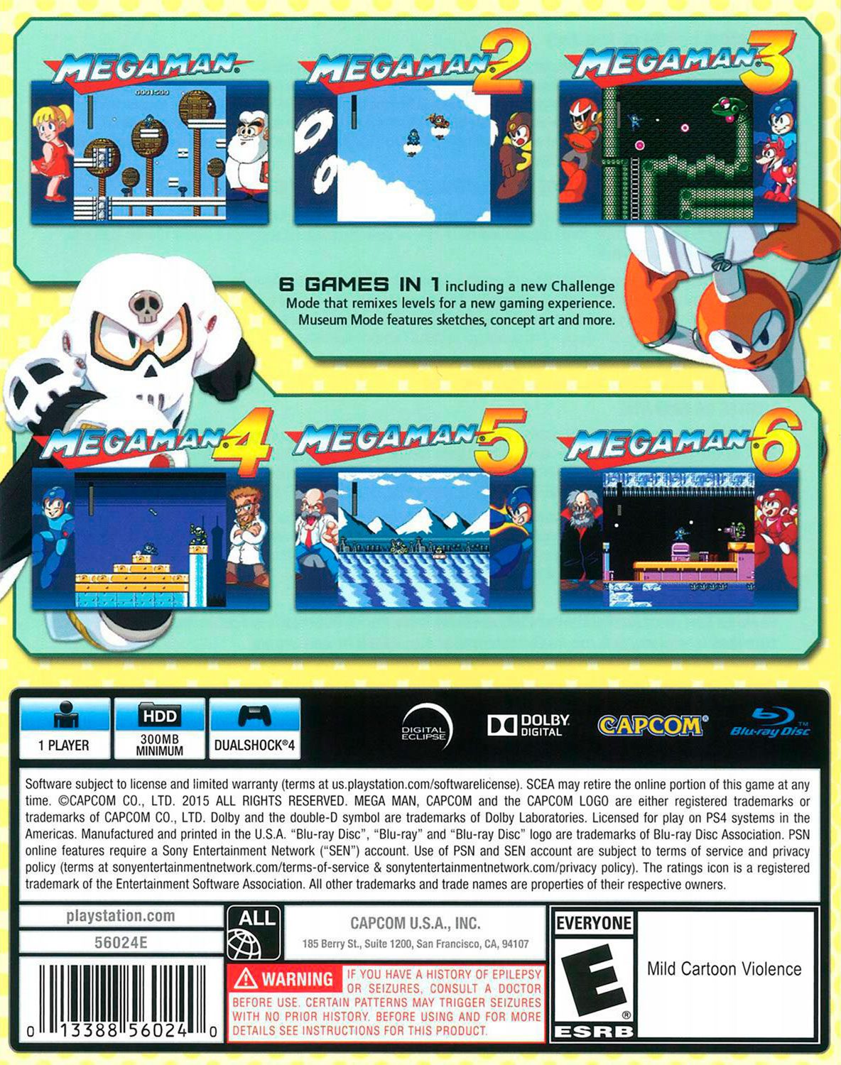Mega Man Legacy Collection es una celebración de la historia de 8 bits del icónico bombardero azul. La Legacy Collection presenta reproducciones muy fieles a los orígenes de la serie, con los seis juegos originales de Mega Man, esto despertará los recuerdos de los fans e introducirá a los recién llegados en lo que convirtió a Mega Man en un personaje tan popular. Mega Man Legacy Collection contiene los seis juegos y más.