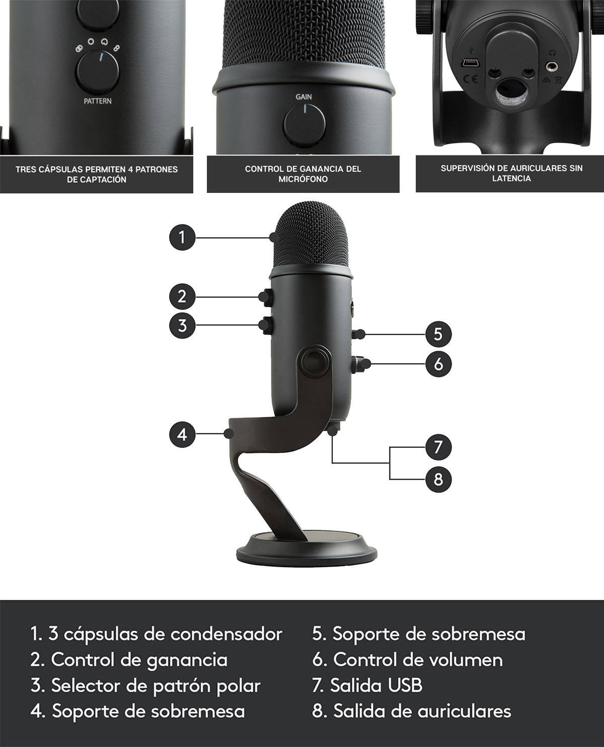 Yeti es el micrófono USB multi-patrón más versátil y avanzado del mundo. Al combinar tres cápsulas y cuatro configuraciones de patrones distintas, Yeti es la herramienta definitiva para crear grabaciones increíbles, directamente en tu PC. Con un sonido y rendimiento excepcionales, Yeti puede capturar voces, instrumentos, podcasts, juegos, audio para vídeo, entrevistas y más con una sorprendente claridad y facilidad. Yeti utiliza un conversor A-D de alta calidad, incluye un amplificador para auriculares para monitorizar el audio con latencia cero y controles directos para el volumen de los auriculares, selección de patrones, mute instantáneo y ganancia del micrófono. No tendrás que instalar ningún driver en tu Mac o PC, Yeti es el micro USB más versátil que podrás encontrar.