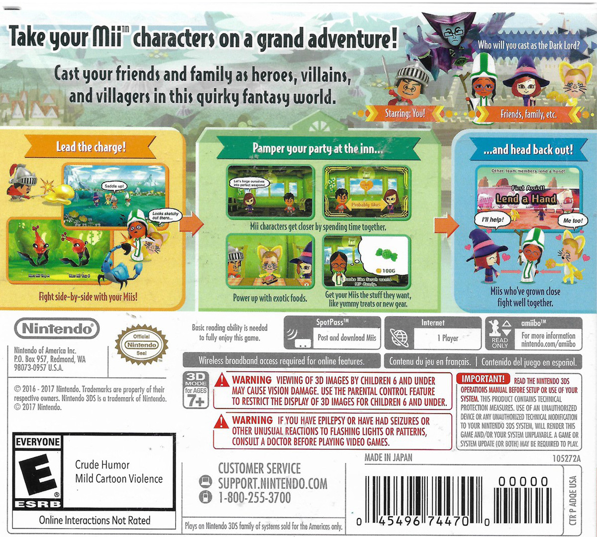 Desde el comienzo del mundo, guerreros se han unido para combatir el mal. Y ahora… personajes Mii™ basados en tus personas favoritas, ¡se unirán y lucharán para salvar Miitopia! Elige su rol en el reino, gestiona sus amistades y dales oficios con distintas estadística, habilidades, atuendos y apariencia. ¡Prepárate para la diversión!