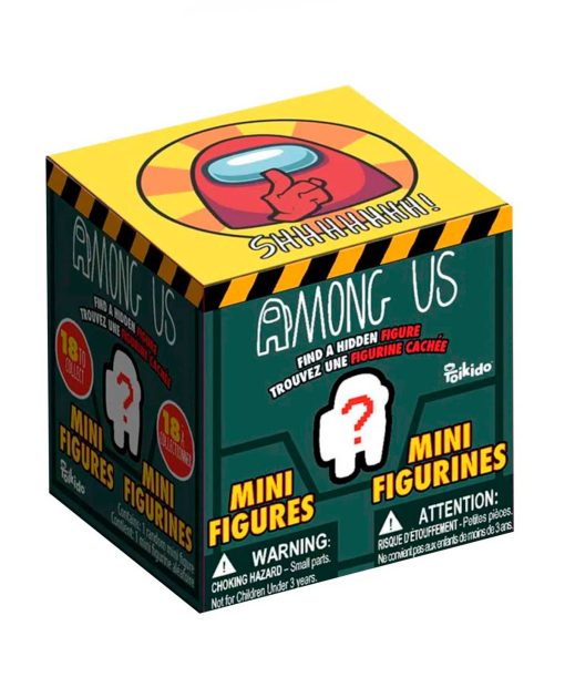 - Cada caja ciega viene con una minifigura aleatoria de Among us de 2" pulgadas.