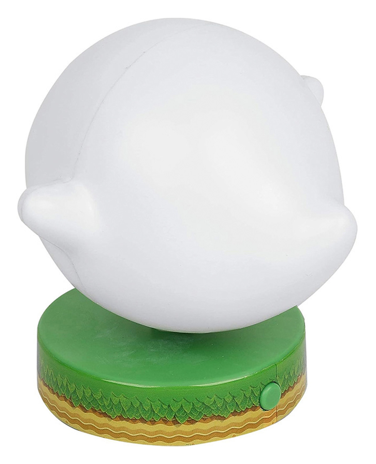 Tiene tres luces LED en el interior, funciona con pilas (3 pilas AAA) y tiene un botón de encendido/apagado en la base. Esta luz 3D de Boo es un producto con licencia oficial de Super Mario.