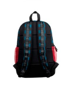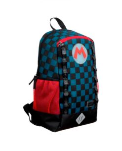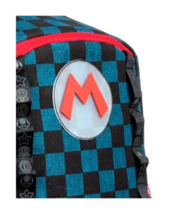 Cuenta con el logotipo de Mario en una mochila a cuadros con bolsillos tejidos, además de un patrón de los más icónicos elementos de Mario Kart y Mario Bros como champiñones, flor de fuego, estrellas y monedas.