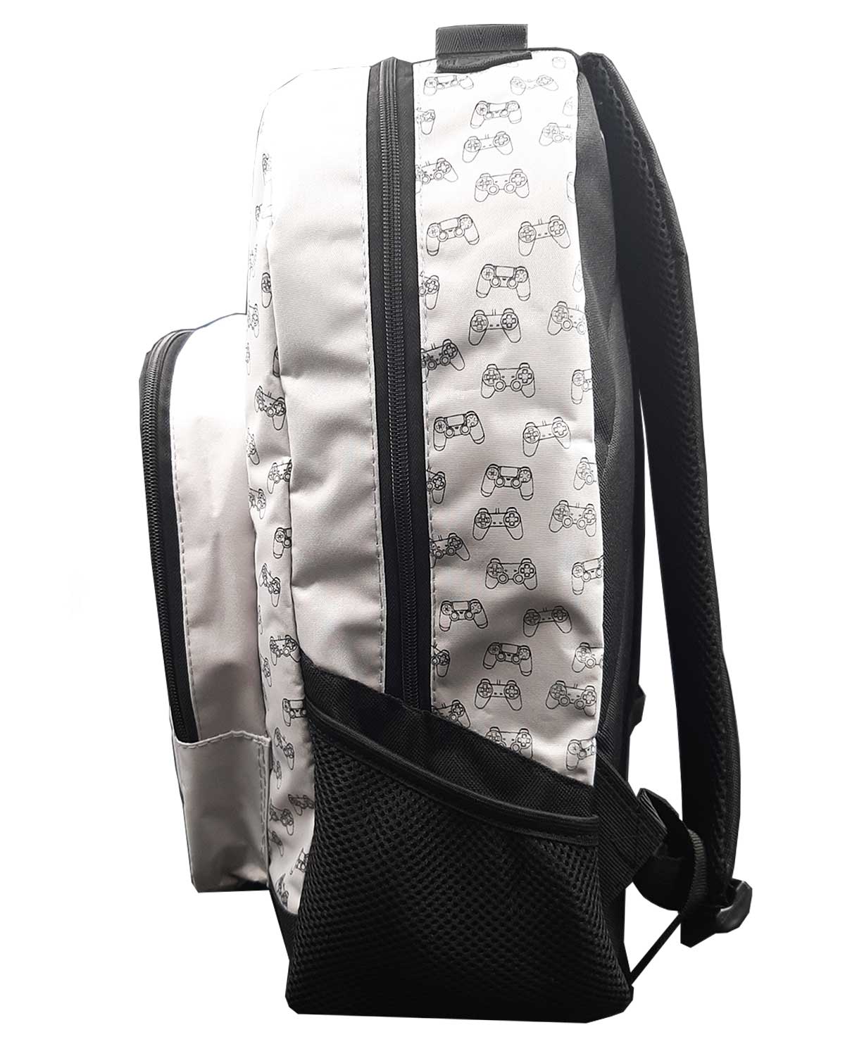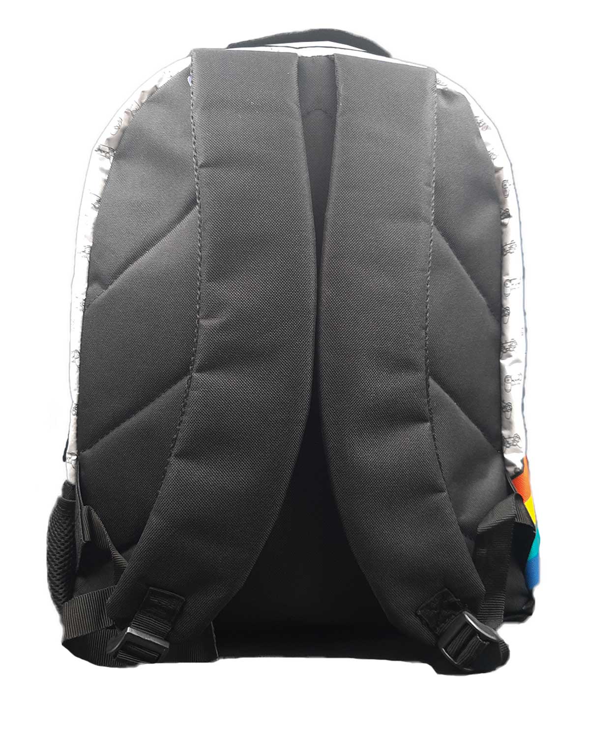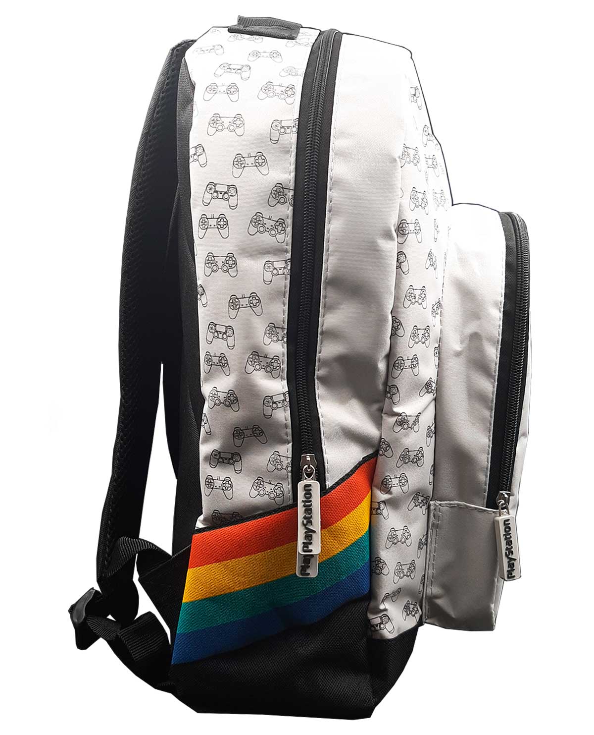 Su diseño es único e inspirador, en la bolsa frontal verás el símbolo PlayStation con sus colores iniciales, tiene un estampado de pequeños controles Dualshock que le dan un toque retro, además, en un lado viene una pequeña red para que puedas guardar tu botella de agua.