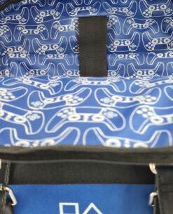Mochila Negra con azul, detalles en serigrafia, interior estampado con patrón de controles dualsense y compartimento interno para laptop.