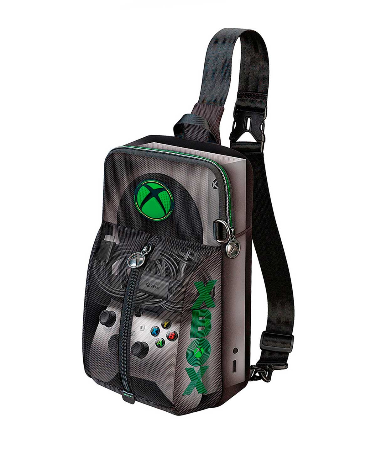 El bolsillo principal puedes guardar el sistema Xbox Series S. El bolsillo frontal puede guardar el control Xbox, el cable HDMI y el cable de alimentación; además, cuenta con un divisor con elástico que sujeta de forma segura la tarjeta de expansión de almacenamiento Seagate y protege los dispositivos analógicos.