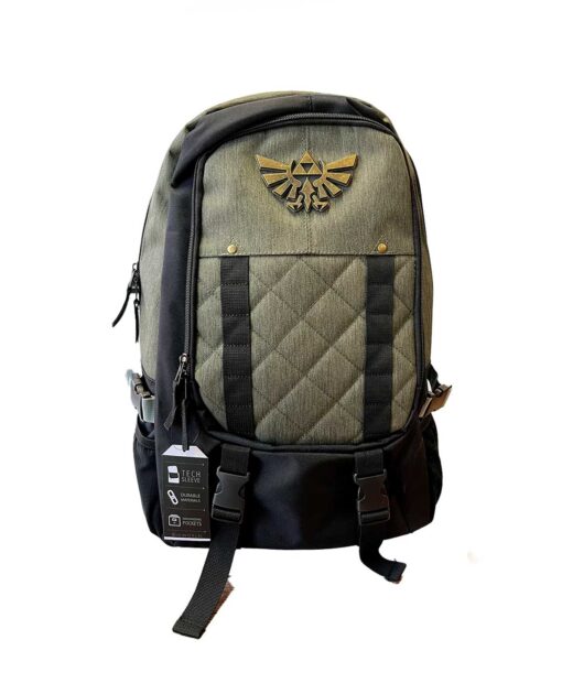 Esta mochila color verde con negro presenta el logo de la Trifuerza en la parte delantera, cuenta con un bolso frontal para guardar elementos extras, además de un compartimiento especial para computadora. Con correas ajustables para adaptar como más te guste y laterales para botella de agua.