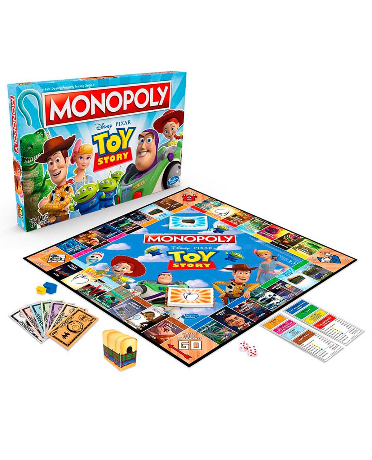 ¡La diversión y estrategia de Monopoly se unen a la magia y simpatía de las películas Toy Story! Los jugadores pueden elegir jugar como Woody, Buzz Lightyear, Bo Peep, Jessie, Alien o Rex. Mientras recorren el tablero pueden visitar algunos de los lugares favoritos que aparecen en las películas, tales como la habitación de Andy, el granero de juguete de Al e incluso la máquina con la pinza. Los jugadores también pueden probar suerte con las tarjetas del baúl de juguetes de Andy y las tarjetas de cumpleaños (que remplazan las tarjetas de Fortuna y de Arca Comunal). Construye casas y paga rentas, intentando ser el jugador con más dinero al final del juego para ganar.